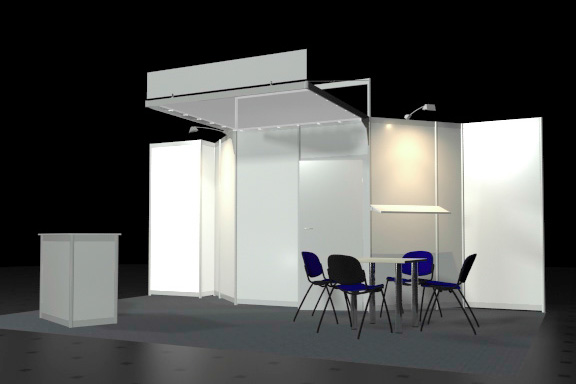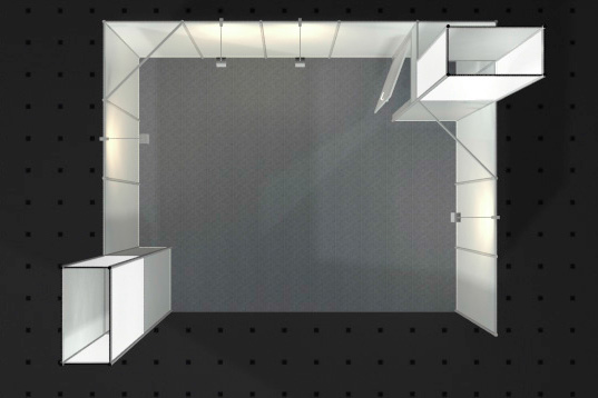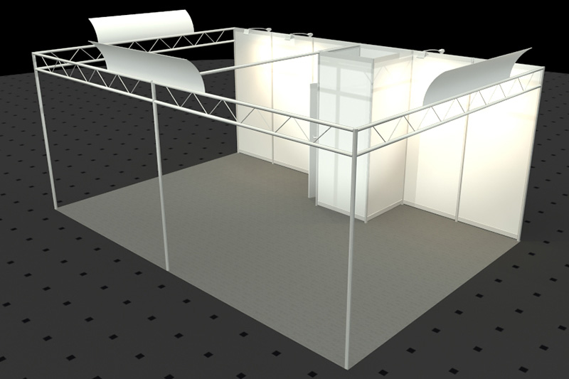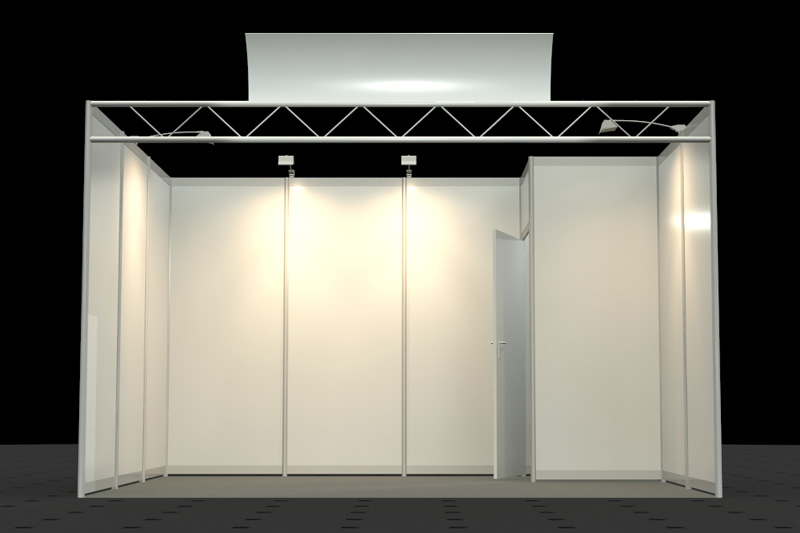 • Wände weiß, Rahmen und Traverse silber (Octanorm Standbausystem)